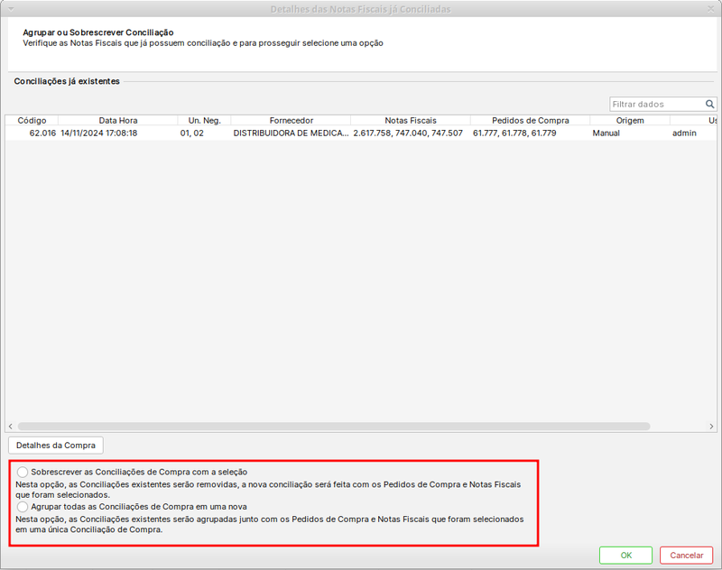 Sobrescrever as Conciliações de Compra com a Seleção: Nesta opção, as Conciliações existentes serão removidas, a nova conciliação será feita com os Pedidos de Compra e Notas Fiscais que foram selecionados.