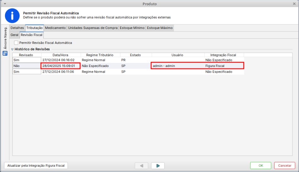 Obs.: A partir da versão 3.77 foram adicionadas novas colunas na guia 'Tributação -> Revisão Fiscal'. Onde serão exibidas informações sobre qual integração e respectivo usuário utilizado para realizar as atualizações.